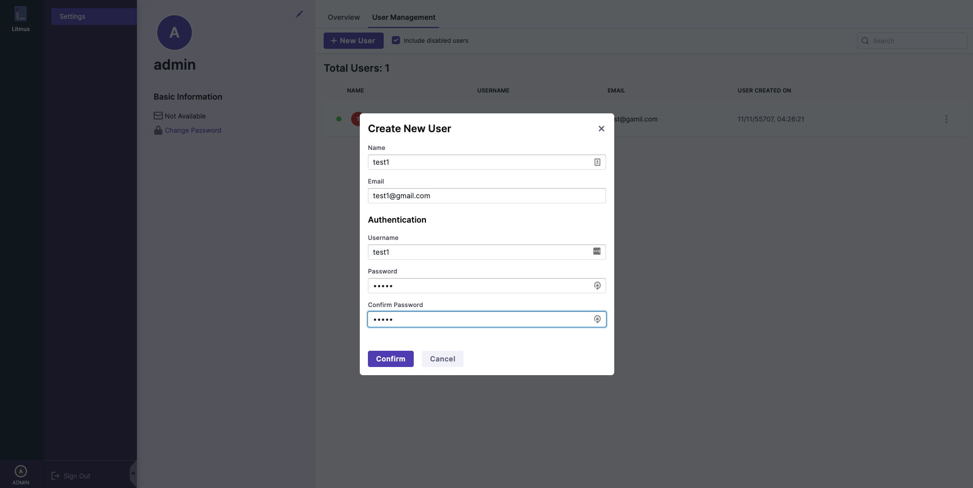 This feature enables the admin to create a new user by assigning a unique username and password for the user. In addition to this, the admin can also provide the name and email address of the new user which is optional.