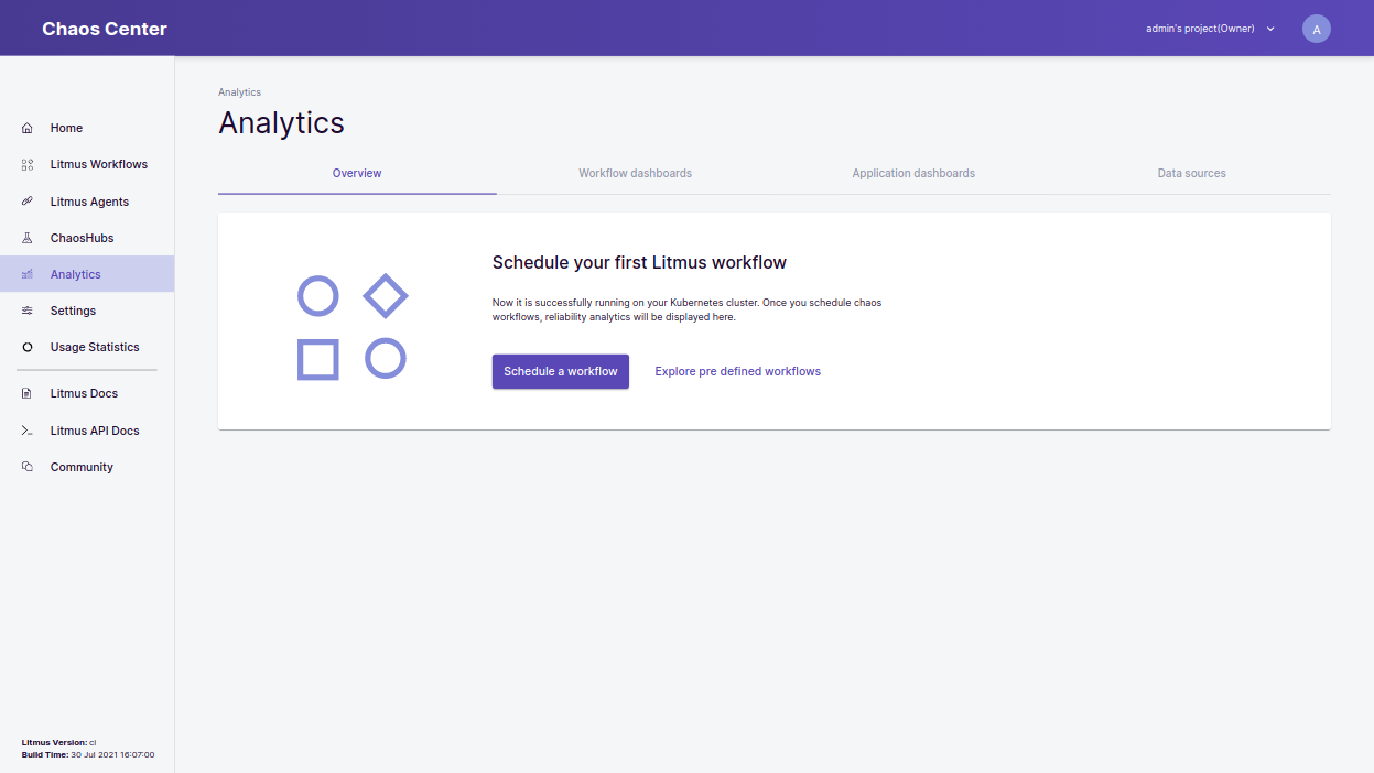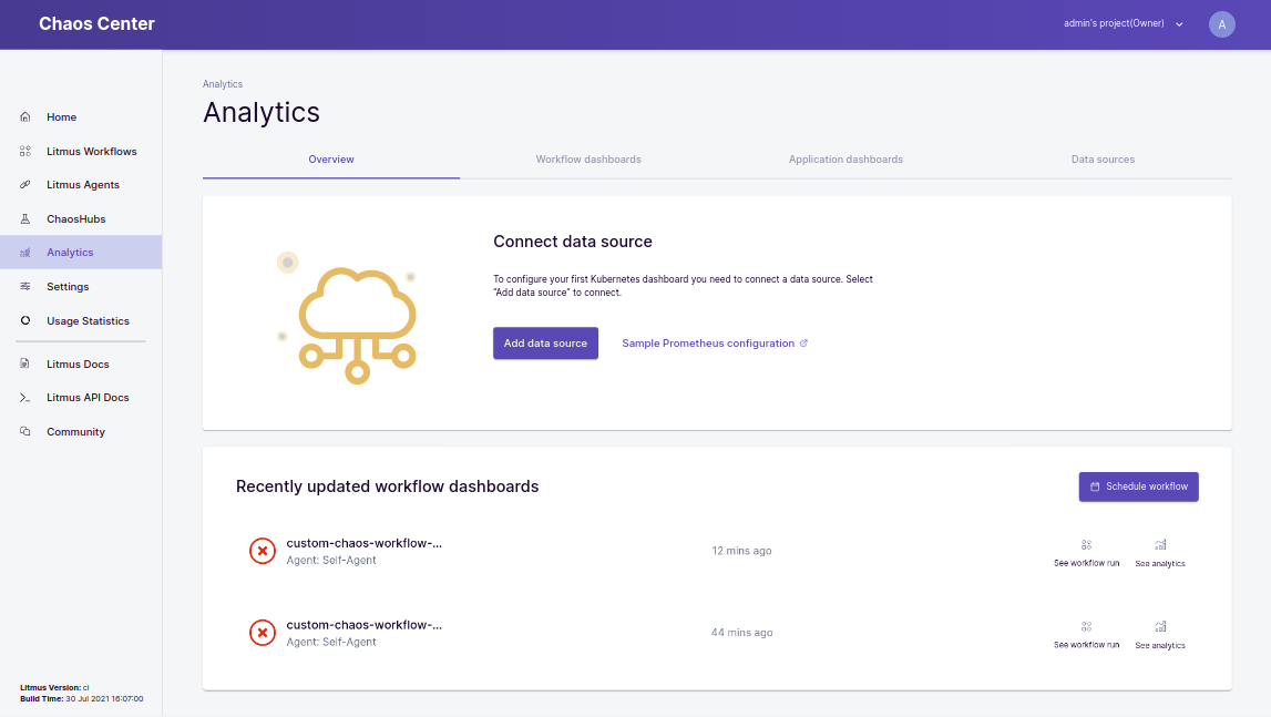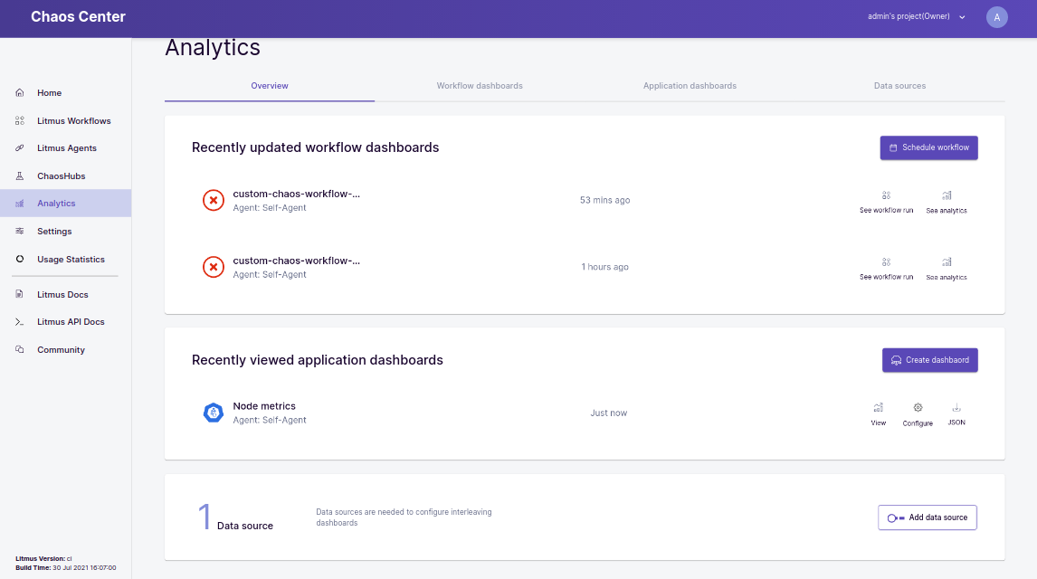 Overview Tab helps you to manage your connected data sources and dashboards, all while making it easier to view and analyze your chaos scenarios. The overview tab is split into 3 parts -